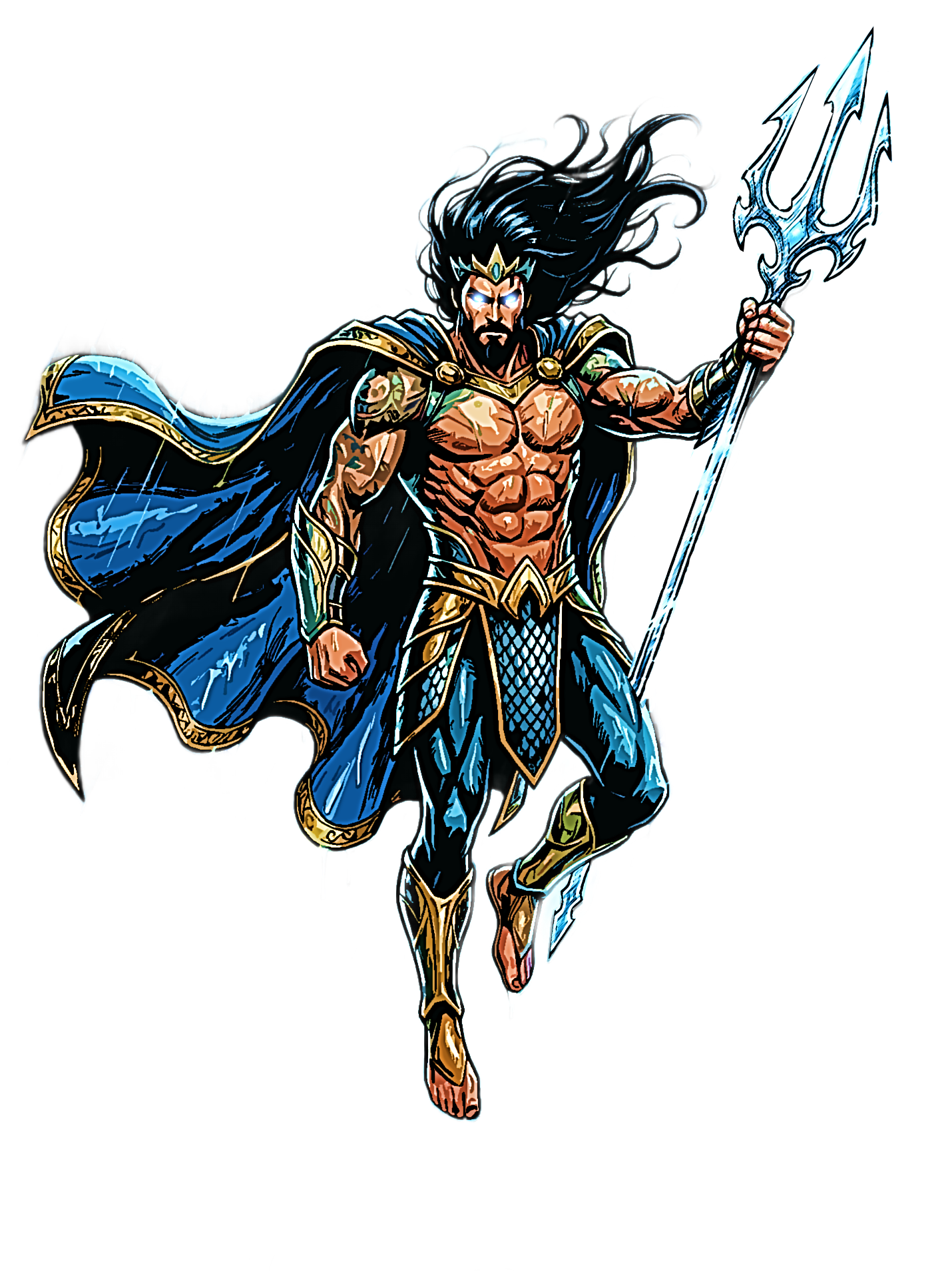 Powers: Superhuman strength, as it is increased further in water, superhuman stamina, speed, and durability. He is able to fly, he can also see clearly in the darkest and deepest parts of the ocean. He also has a telepathic sense to communicate with underwater animals. He has gills on his neck. He also has a connection with weather control.
